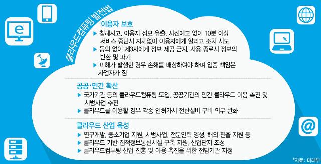 아울러 클라우드 서비스 이용자의 정보보호에 관한 근거가 마련돼, 이용자의 동의 없이 정보를 제3자에게 제공할 경우 5년 이하의 징역 또는 5000만원 이하의 벌금을 부과하고, 서비스가 종료될 경우 정보를 이용자에게 반환하고 파기해야 한다.