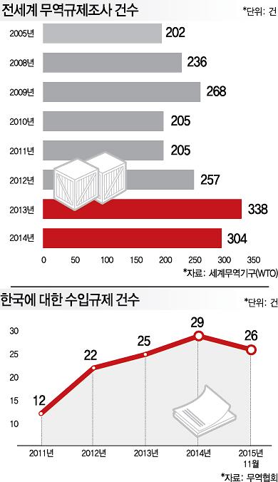 실제 세계무역기구(WTO) 등에 따르면 지난해 전 세계 국가의 무역규제 조사는 총 304건으로, 2005년 202건 대비 50.4%나 증가했다. 우리나라를 대상으로 한 무역규제 조치만 봐도 2011년 12건에서 올 들어 26건으로 2배 이상 급증했다.
