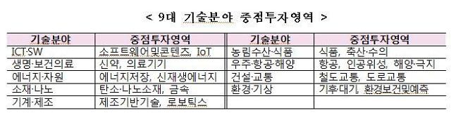 이날 정부가 중장기 투자전략을 꼽은 9대 기술분야는 △ICT·소프트웨어 △생명·보건의료 △에너지·자원 △소재·나노 △기계·제조 △농림수산·식품 △우주·항공·해양 △건설·교통 △환경·기상 등이다.