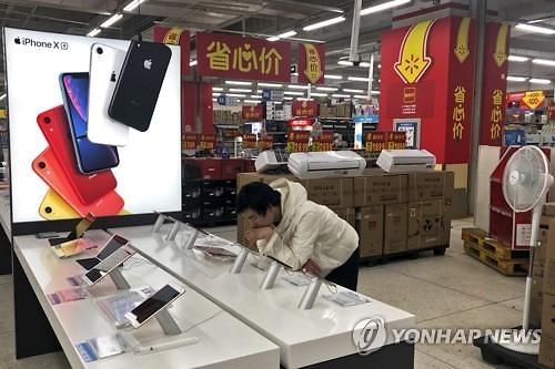 지난 9일 중국 베이징에 있는 대형 가전매장에서 한 남성이 애플 제품이 구비돼 있는 진열대에서 아이폰 제품을 들여다보고 있다. [사진=AP·연합뉴스]