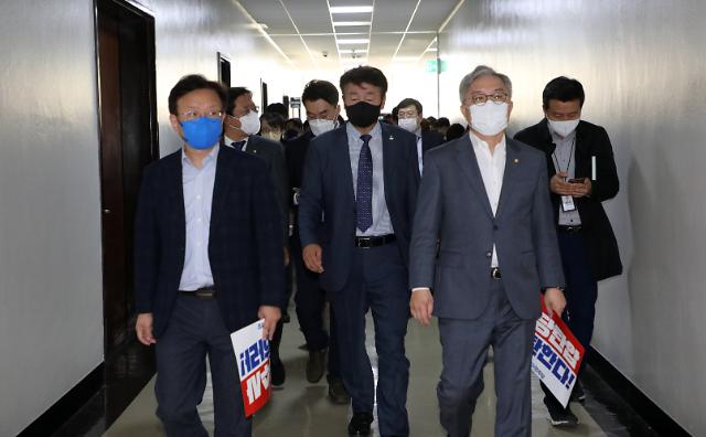 더불어민주당 법사위원들이 지난 20일 국회 법제사법위원회 회의실 앞에서 대검찰청에 대한 국정감사 강행 규탄 기자회견을 한 후 용산 대통령실로 향하고 있다. [사진=연합뉴스]