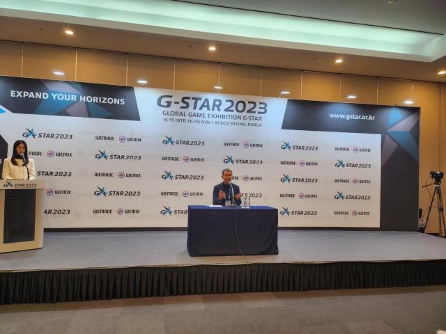 장현국 위메이드 대표가 wk 부산 벡스코에서 열린 ‘지스타 2023’ 도중 기자간담회를 진행하고 있다 사진한영훈 기자