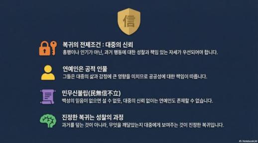 연예인의 복귀를 둘러싸고 다시 사회적 논란이 불거지고 있다. 원산지 표시 및 농지법 위반 의혹이 제기돼 논란이 일었던 백종원씨와, 음주 운전으로 사회적 비판을 받은 곽도원씨의 복귀 움직임을 두고 대중의 시선이 엇갈린다. 과거의 문제를 안고 있는 인물이 다시 방송과 무대에 서는 순간마다, 우리 사회는 같은 질문을 반복한다. 공적 영향력을 지닌 존재가 그에 상응하는 책임을 다했는가 하는 물음이다. 이 논쟁은 단순한 연예계 이슈를 넘어, 공공성과 책임이라는 사회적 기준과 맞닿아 있다. 기본과 상식은 연예계라고 해서