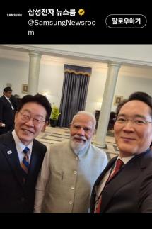 인도를 국빈 방문 중인 이재명 대통령이 20일 뉴델리 총리 청사에서 열린 나렌드라 모디 인도 총리 주최 오찬 및 한-인도 경제인 대화에서 모디 총리, 이재용 삼성전자 회장과 인도산 '갤럭시 Z 플립7'으로 기념 촬영을 하고 있다.