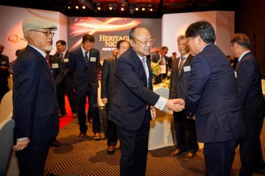 김승연 회장이 4월 16일 북일학원 퇴직교사 초청만찬에 참석한 선생님들과 인사를 하고 있다.