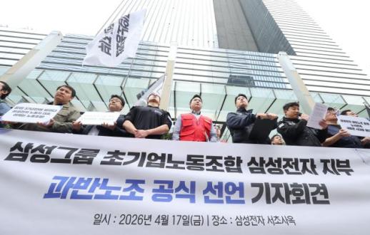 17일 서울 삼성전자 서초사옥 앞에서 삼성그룹 초기업노동조합 조합원들이 과반노조 공식 선언 기자회견을 하고 있다.