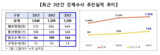 임금체불 '무관용'...압수수색·체포 등 강제수사 확대 임금체불 사업주에 대한 정부의 형사 대응이 한층 강경해지고 있다. 정부가 지난해 임금체불 사건과 관련해 압수수색·체포·구속 등 강제 수사를 늘리며 고의·상습 체불에 대해 '무관용 원칙'을 분명히 했다. 고용노동부는 지난해 임금체불 사업주를 대상으로 144건의 압수수색을 진행했다고 27일 밝혔다. 이는 전년 같은 기간(109건)보다 30% 이상 늘어난 것이다. 노동부는 이와 함께 체포영장 644건, 통신영장 548건을 집행했으며, 구속수사도 14건 집행했다. 최근 3년간 임금체불에 대 2026-01-27 12:00:00 -
