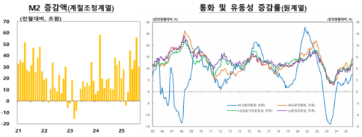 시중 유동성 6개월째↑…M2 증가량 두 달 연속 8%대 시중 유동성을 나타내는 광의통화(M2)가 6개월째 늘며 증가세를 이어갔다. 기업과 가계 자금이 요구불예금과 수익증권으로 유입되면서 전년 대비 증가율은 8%대를 유지했다. 한국은행이 12일 발표한 '통화 및 유동성' 통계에 따르면 9월 평균 광의 통화량(M2 기준·평잔)은 전월보다 0.7%(30조3000억원) 증가한 4430조5000억원으로 집계됐다. 지난 3월 이후 6개월 연속 증가세다. M2의 전년 동월 대비 증가율은 8.5%로 올라섰다. 지난 8월(8.1%)에 이어 두 달 연속 8%대 증가세다. 넓은 의미의 통 2025-11-12 12:00:00 -