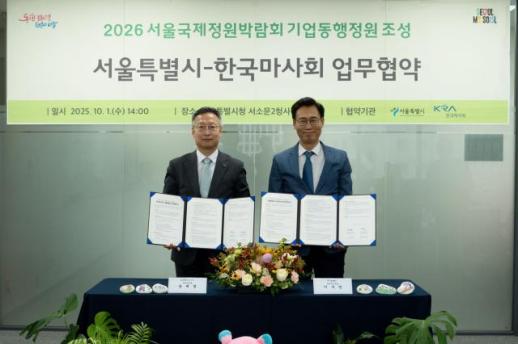 마사회, 서울시와 국제정원박람회 1호 동행정원 조성 맞손 한국마사회는 최근 서울시와 '2026 서울국제정원박람회 1호 동행정원 조성을 위한 업무협약'을 체결했다고 20일 밝혔다. 이번 협약은 내년 서울숲에서 열리게 될 서울국제정원박람회에서 마사회와 서울시가 협력해 '한국마사회 동행정원'을 조성하는 내용을 담고 있다. 도심 승마 체험 프로그램을 선보이는 등 녹지 확충을 통한 ESG경영 및 사회공헌을 실천하겠다는 목표다. 협약에 따라 마사회는 △동행정원 기획 △설계 및 시공 △도심공원 승마체험 프로그램 운영 등을 맡고 서울시는 △대상지 2025-10-20 10:08:30