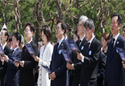 이재명 대통령이 19일 서울 강북구 국립 4·19민주묘지에서 열린 4·19혁명 기념식에서 4·19의 노래를 부르고 있다. 김 여사 오른쪽으로 우원식 국회의장, 김상환 헌법재판소장, 노태악 중앙선거관리위원장, 더불어민주당 정청래 대표