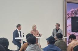 21일 서울 강남에 있는 마이바흐 브랜드센터 서울에서 열린 미디어 간담회에서 (왼쪽부터) 마티아스 바이틀 벤츠코리아 사장, 크리스티나 셴크 메르세데스-벤츠 AG 디지털&커뮤니케이션 및 IR 총괄 부사장 등 관계자들이 말하고 있다.