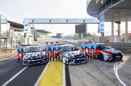 독일 뉘르부르크링 서킷에서 경주차 엘란트라 N1 RP와 엘란트라 N TCR을 배경으로 드라이버들이 기념촬영을 하고 있다.