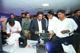 한화비전이 인도 벵갈루루에서 진행한 제품 설명회에서 기업 관계자들이 인공지능(AI)카메라를 살펴보고 있다.