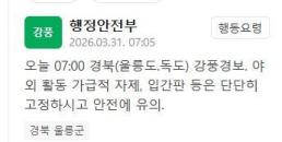 31일 행정안전부는 안전재난문자를 통해 "이날 오전 7시 경북(울릉도·독도) 강풍경보"라며 "야외 활동 가급적 자제, 입간판 등은 단단히 고정하시고 안전에 유의"하라고 당부했다.