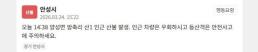 24일 천안시는 안전재난문자를 통해 "이날 오전 11시 54분경 서북구 입장면 호당리에서 산불 발생했다"며 "입산 금지. 인근 주민과 등산객은 안전사고에 주의하라"고 당부했다.