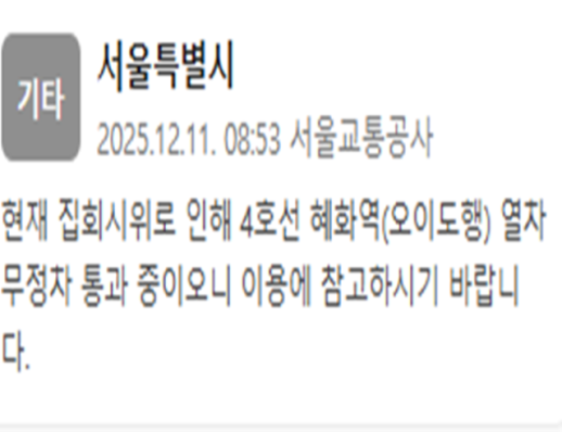 서울교통공사는 11일 오전 8시 53분께 "현재 집회 시위로 인해 4호선 혜화역(오이도행) 열차가 무정차 통과되고 있다"는 내용의 재난문자를 발송했다.