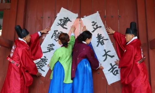 입춘을 이틀 앞둔 2일 인천 미추홀구 인천향교에서 유림이 입춘 첩을 붙이고 있다.