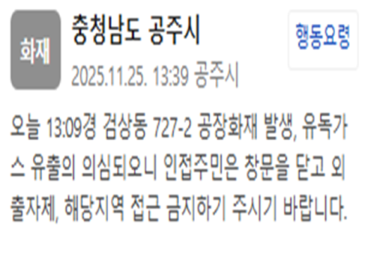 공주시는 25일 "오늘 오후 1시 9분께 검상동 727-2 공장에서 화재가 발생했다"는 내용의 재난문자를 발송했다.