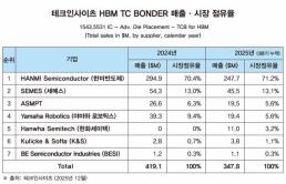한미반도체, 테크인사이츠 HBM TC 본더 세계 점유율 71% 한미반도체가 2025년 전세계 HBM(고대역폭메모리)용 TC 본더 시장에서 점유율 1위를 기록하며 기술 리더십을 입증했다. 글로벌 반도체 시장조사기관 테크인사이츠(TechInsights)가 19일(미국 현지시간) 발표한 '2025년 HBM용 TC 본더 시장 보고서'에 따르면 한미반도체는 2025년 3분기 누적 매출로 2억4770만 달러 (약 3660억원)를 기록하며 71.2%의 점유율로 1위를 차지했다. TC 본더는 HBM 제조 공정에서 메모리 칩을 고온·고압으로 정밀하게 접합하는 핵심 장비다. AI 반도체 수요 급증에 따라 HBM 2025-12-22 08:56:30 -