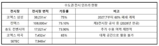 공대위, 김원이 의원과 면담…코엑스 전시장 폐쇄 계획 재조정 요청 전시산업 정상화 추진을 위한 공동대책위원회(위원장 강주용, 이하 공대위)는 29일 국회 산업통상자원중소벤처기업위원회 더불어민주당 간사 김원이 의원을 만나 코엑스 리모델링에 따른 주요 전시장 폐쇄 계획과 관련해 조정 필요성을 전달하고 국회의 중재를 요청했다. 강주용 위원장은 “무역협회 계획에 따라 2027년 7월부터 약 1년 6개월간 전시장이 폐쇄될 경우 수출 중소기업의 수출 감소 규모가 4조 3천억 원 수준에 이를 것으로 예상된다”며 “이는 MICE 산업 육성 정책과의 정합성 측면에서 검 2026-04-30 11:23:14 -