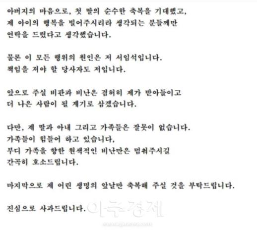 '제 딸 돌 축복' 문자 논란 광주시의원 "사과한다…가족 잘 못 없어" 자녀의 첫돌을 알리는 문자를 공직자들에게 보냈다가 논란에 휩싸인 서임석 광주시의원이 사과했다. 4일 서 의원은 자신의 사회관계망서비스(SNS)를 통해 "아버지의 마음으로 첫딸의 순수한 축복을 기대했고, 제 아이의 행복을 빌어주시리라 생각되는 분들께만 연락을 드렸다고 생각했다"며 "행위의 원인은 저(서임석)이고, 책임을 져야 할 당사자도 저이다. 진심으로 사과드린다"고 밝혔다. 이어 "앞으로 주실 비판과 비난은 겸허히 제가 받아들이고, 더 나은 사람이 될 계기로 삼겠다"고 2025-11-04 14:49:03 -