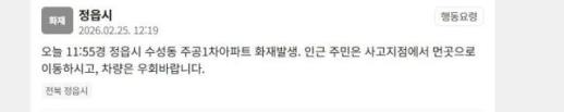 정읍 수성동 아파트서 화재…"먼 곳으로 이동" 전라북도 정읍시에서 화재가 발생했다. 25일 정읍시는 안전재난문자를 통해 "이날 오전 11시 55분경 정읍시 수성동 주공1차아파트 화재발생했다"며 "인근 주민은 사고지점에서 먼곳으로 이동하시고, 차량은 우회바란다"고 당부했다. 2026-02-25 13:04:35 -