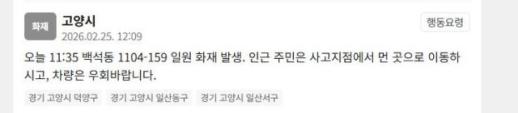 고양시 백석동 화재…"주민 이동" 경기도 고양시 일산동구 백석동에서 화재가 발생했다. 25일 고양시는 안전재난문자를 통해 "이날 오전 11시 35분경백석동 1104-159 일원 화재 발생했다"며 "인근 주민은 사고지점에서 먼 곳으로 이동하시고, 차량은 우회바란다"고 당부했다. 2026-02-25 13:06:59 -