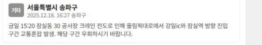 송파구 잠실동서 크레인 전도 사고 발생…"강일ic와 잠실역 방향 진입구간" 서울 송파구 잠실동에서 크레인 전도 사고가 발생했다. 18일 송파구는 안전재난문자를 통해 "이날 15시 20분경 잠실동 30 공사장 크레인 전도로 인해 올림픽대로에서 강일ic와 잠실역 방향 진입구간 교통혼잡이 발생했다"며 "해당 구간 우회하시기 바란다"고 밝혔다. 2025-12-18 16:39:37 -