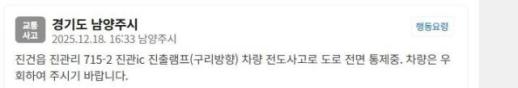 남양주시 진건읍 진관리서 차량 전도 사고 발생…"도로 전면 통제 중" 경기도 남양주시 진건읍 진관리에서 차량 전도사고가 발생했다. 18일 남양주시는 안전재난문자를 통해 "현재 진건읍 진관리 715-2 진관ic 진출램프(구리방향) 차량 전도사고로 도로 전면 통제 중"이라며 "차량은 우회하여 주시기 바란다"고 밝혔다. 아직 정확한 사고 원인은 파악되지 않았다. 2025-12-18 16:46:58 -