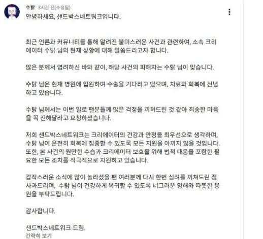 송도 납치당한 유튜버는 수탉이었다…"치료·회복 전념" 인기 게임 유튜버 '수탉'이 인천 연수구 송도동의 한 아파트 지하 주차장에서 발생한 납치 사건의 피해자인 것으로 알려졌다. 29일 샌드박스네트워크는 수탉의 유튜브 게시물에 "최근 언론과 커뮤니티를 통해 알려진 불미스러운 사건과 관련해 해당 사건의 피해자는 수탉이 맞다"고 말했다. 이어 "수탉은 현재 병원에 입원하여 수술을 기다리고 있으며, 치료와 회복에 전념하고 있다"며 "수탉은 이번 일로 팬분들께 많은 걱정을 끼쳐드린 것 같아 죄송한 마음을 꼭 전해달라고 요청했다 2025-10-29 13:40:43 -