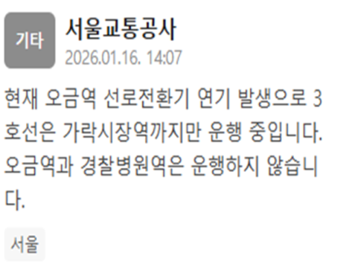[속보] 서울 3호선 오금역 연기 발생, 지하철 일시 정차중 서울 3호선 오금역 연기 발생, 지하철 일시 정차중 2026-01-16 14:09:40 -