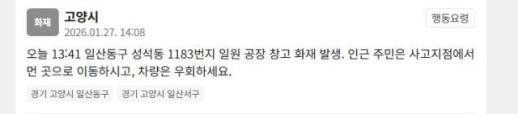 고양시 일산동구 성석동 화재…"공장 창고서 발생" 경기도 고양시 일산동구 성석동에서 화재가 발생했다. 27일 고양시는 안전재난문자를 통해 "이날 오후 1시 41분 일산동구 성석동 1183번지 일원 공장 창고 화재 발생했다"며 "인근 주민은 사고지점에서 먼 곳으로 이동하시고, 차량은 우회하라"고 당부했다. 2026-01-27 14:12:04 -