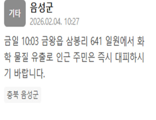 충북 음성군 금왕읍서 화학 물질 유출…"즉시 대피하라" 충북 음성군서 화학 물질이 유출됐다. 음성군은 4일 "금일 오전 10시 3분께 금왕읍 삼봉리 641 일원에서 화학 물질 유출이 일어났다"는 내용의 재난문자를 발송했다. 이어 "인근 주민은 즉시 대피하시길 바란다"고 당부했다. 아울러 음성군은 이날 오전 10시 43분께 "금일 금왕읍 삼봉리 641 화학사고(수산화나트륨 증기유출) 관련 인근 300m 반경 주민분들은 즉시 대피하라"고 재차 재난문자를 보냈다. 2026-02-04 10:45:50 -