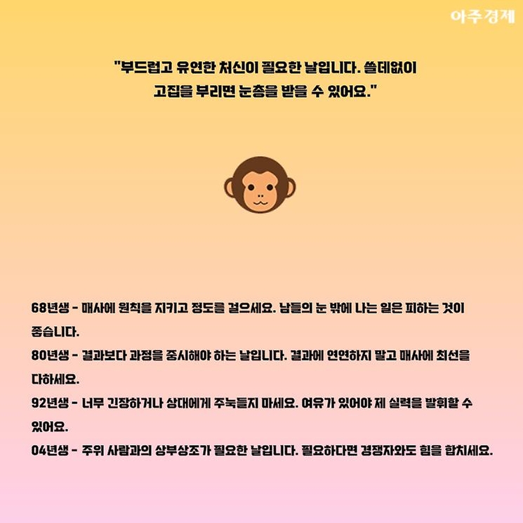 ▶원숭이띠 오늘의 운세 "부드럽고 유연한 처신이 필요한 날입니다. 쓸데없이 고집을 부리면 눈총을 받을 수 있어요."