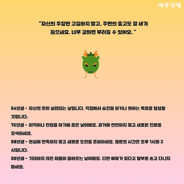 ▶용띠 오늘의 운세 "자신의 주장만 고집하지 말고, 주변의 충고도 잘 새겨 들으세요. 너무 강하면 부러질 수 있어요. "