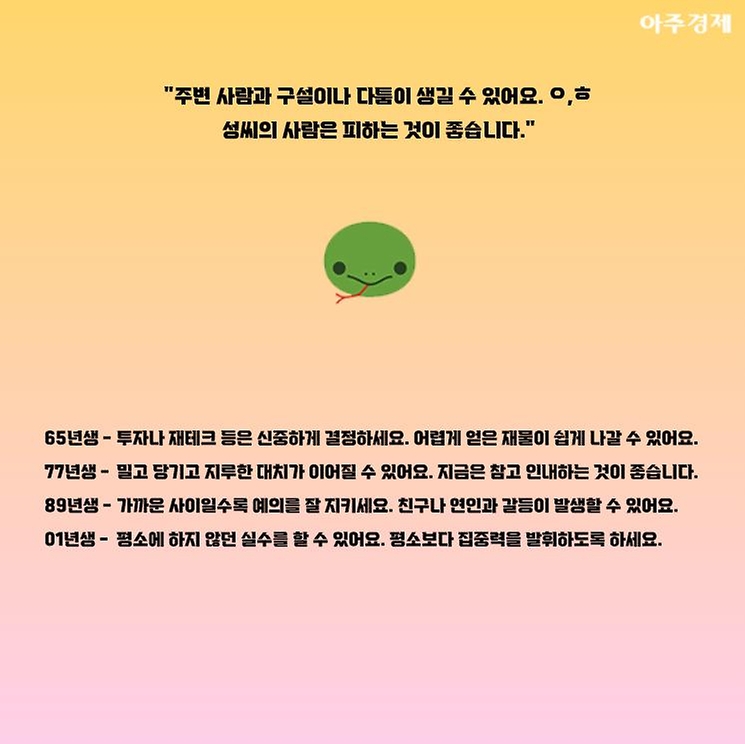 ▶뱀띠 오늘의 운세 "주변 사람과 구설이나 다툼이 생길 수 있어요. ㅇ,ㅎ 성씨의 사람은 피하는 것이 좋습니다."