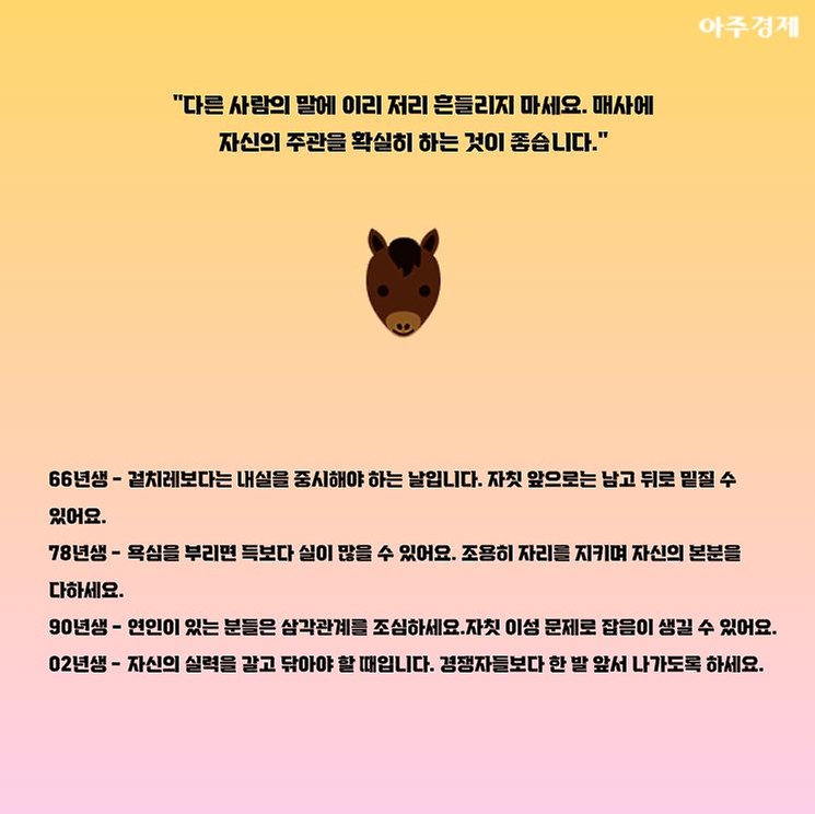 ▶말띠 오늘의 운세 "다른 사람의 말에 이리 저리 흔들리지 마세요. 매사에 자신의 주관을 확실히 하는 것이 좋습니다."