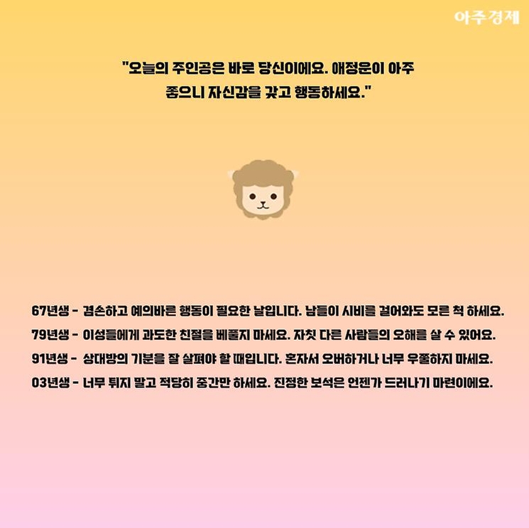 ▶양띠 오늘의 운세 "오늘의 주인공은 바로 당신이에요. 애정운이 아주 좋으니 자신감을 갖고 행동하세요."