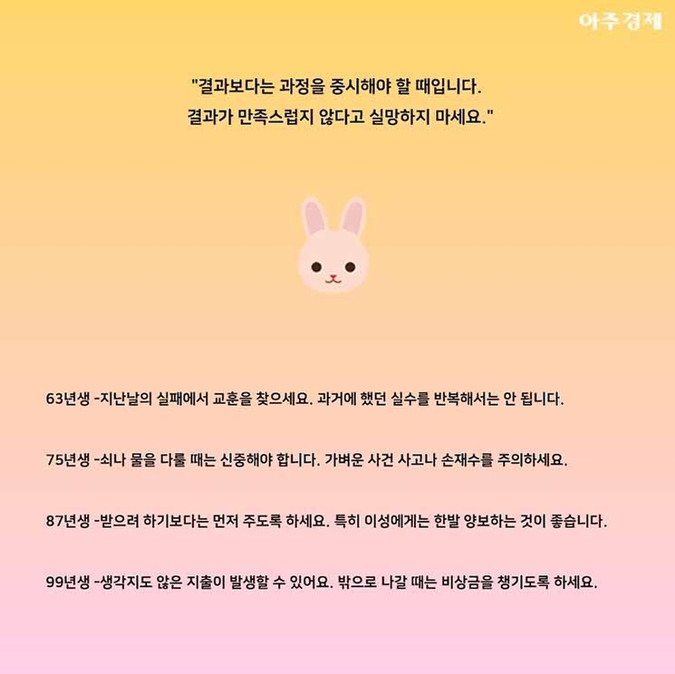 ▶토끼띠 오늘의 운세 "결과보다는 과정을 중시해야 할 때입니다. 결과가 만족스럽지 않다고 실망하지 마세요."