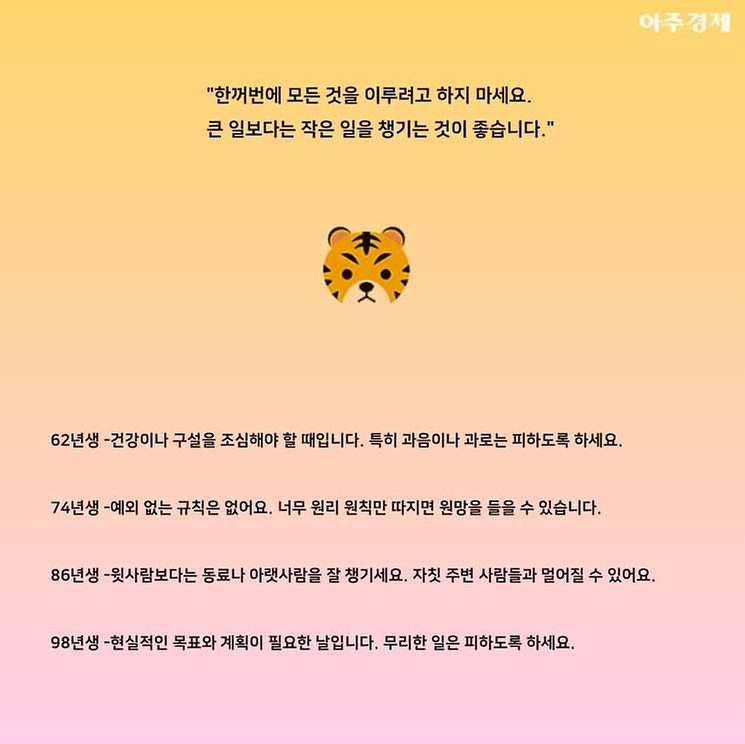 ▶호랑이띠 오늘의 운세 "한꺼번에 모든 것을 이루려고 하지 마세요. 큰 일보다는 작은 일을 챙기는 것이 좋습니다."