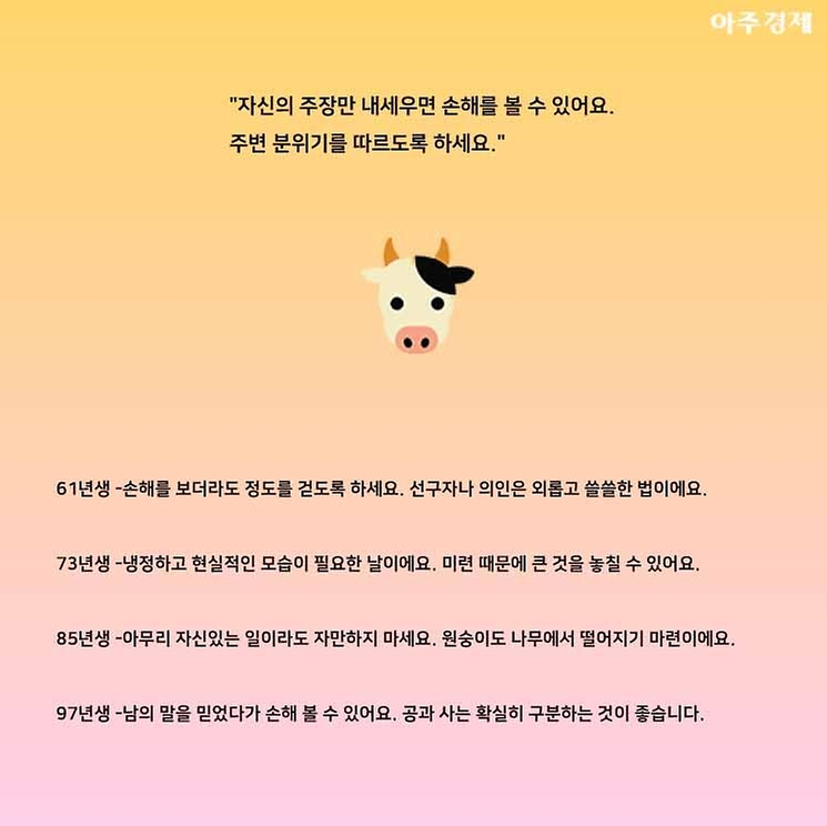 97년생 -남의 말을 믿었다가 손해 볼 수 있어요. 공과 사는 확실히 구분하는 것이 좋습니다.