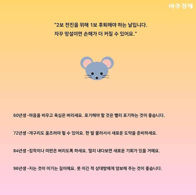 ▶쥐띠 오늘의 운세 "2보 전진을 위해 1보 후퇴해야 하는 날입니다. 자꾸 망설이면 손해가 더 커질 수 있어요."