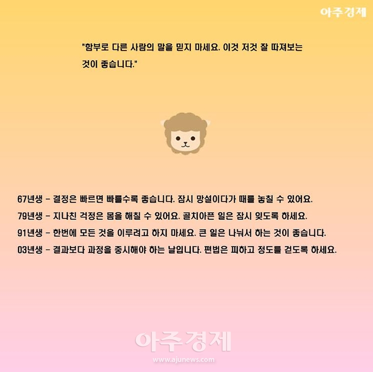▶양띠 오늘의 운세 "함부로 다른 사람의 말을 믿지 마세요. 이것 저것 잘 따져보는 것이 좋습니다."