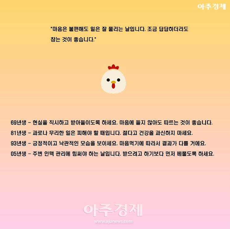 ▶닭띠 오늘의 운세 "마음은 불편해도 일은 잘 풀리는 날입니다. 조금 답답하더라도 참는 것이 좋습니다."