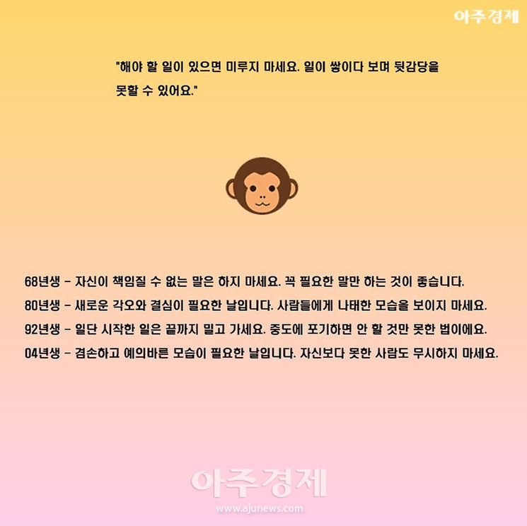 ▶원숭이띠 오늘의 운세 "해야 할 일이 있으면 미루지 마세요. 일이 쌓이다 보며 뒷감당을 못할 수 있어요."