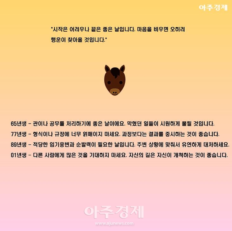 ▶말띠 오늘의 운세 "새로운 일을 시작하기에 좋은 날입니다. 다만, 불이나 화기를 다룰 때에는 신중을 기하세요."