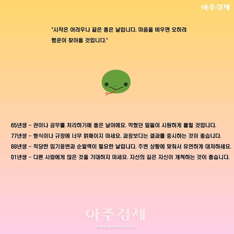 ▶뱀띠 오늘의 운세  "시작은 어려우나 끝은 좋은 날입니다. 마음을 비우면 오히려 행운이 찾아올 것입니다."