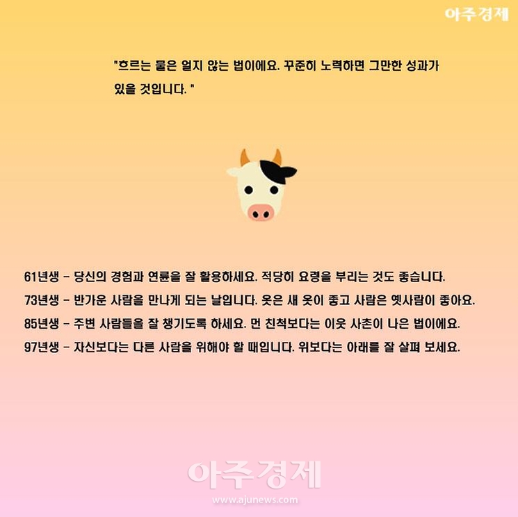 ▶돼지띠 오늘의 운세 "고진감래, 고생 끝에 기쁨이 찾아올 거에요. 오늘 하루는 마음껏 즐기셔도 좋습니다."