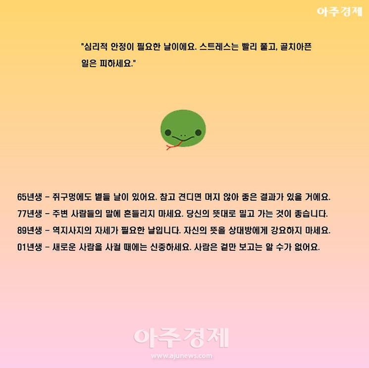 ▶뱀띠 오늘의 운세 "심리적 안정이 필요한 날이에요. 스트레스는 빨리 풀고, 골치아픈 일은 피하세요."