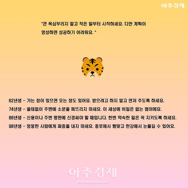 ▶호랑이띠 오늘의 운세 "큰 욕심부리지 말고 작은 일부터 시작하세요. 다만 계획이 엉성하면 성공하기 어려워요. "